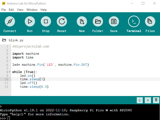 1 2 3 4 5 6 7 8 9 10 11 12 | #diyprojectslab.com import machine import time led= machine.Pin('LED', machine.Pin.OUT) while (True): led.on() time.sleep(1) led.off() time.sleep(0.5) |