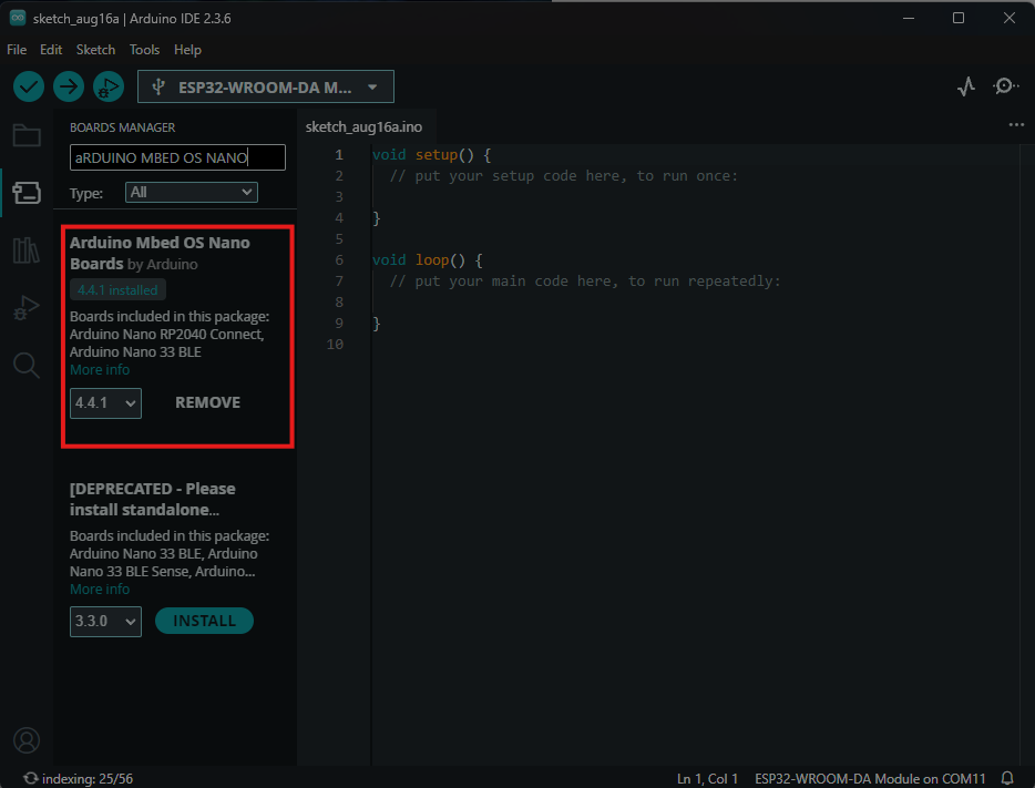 - Open Tools → Board → Boards Manager…. then Search for Arduino Mbed OS Nano Boards.