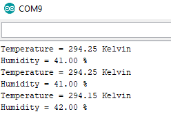 1 2 3 4 5 6 7 8 9 10 11 12 13 14 15 16 17 18 19 20 21 22 23 | #diyprojectslab,com #include "DHT.h" #define DHTPIN 2 // define the digital I/O pin #define DHT11TYPE DHT11 // DHT 11 DHT dht11(DHTPIN, DHT11TYPE); void setup() { Serial.begin(9600); dht11.begin(); } void loop() { float h11 = dht11.readHumidity(); float t11 = dht11.readTemperature(); Serial.print("Temperature = "); Serial.print(t11 + 273.15); Serial.println(" Kelvin"); Serial.print("Humidity = "); Serial.print(h11); Serial.println(" %"); delay(1000); } |