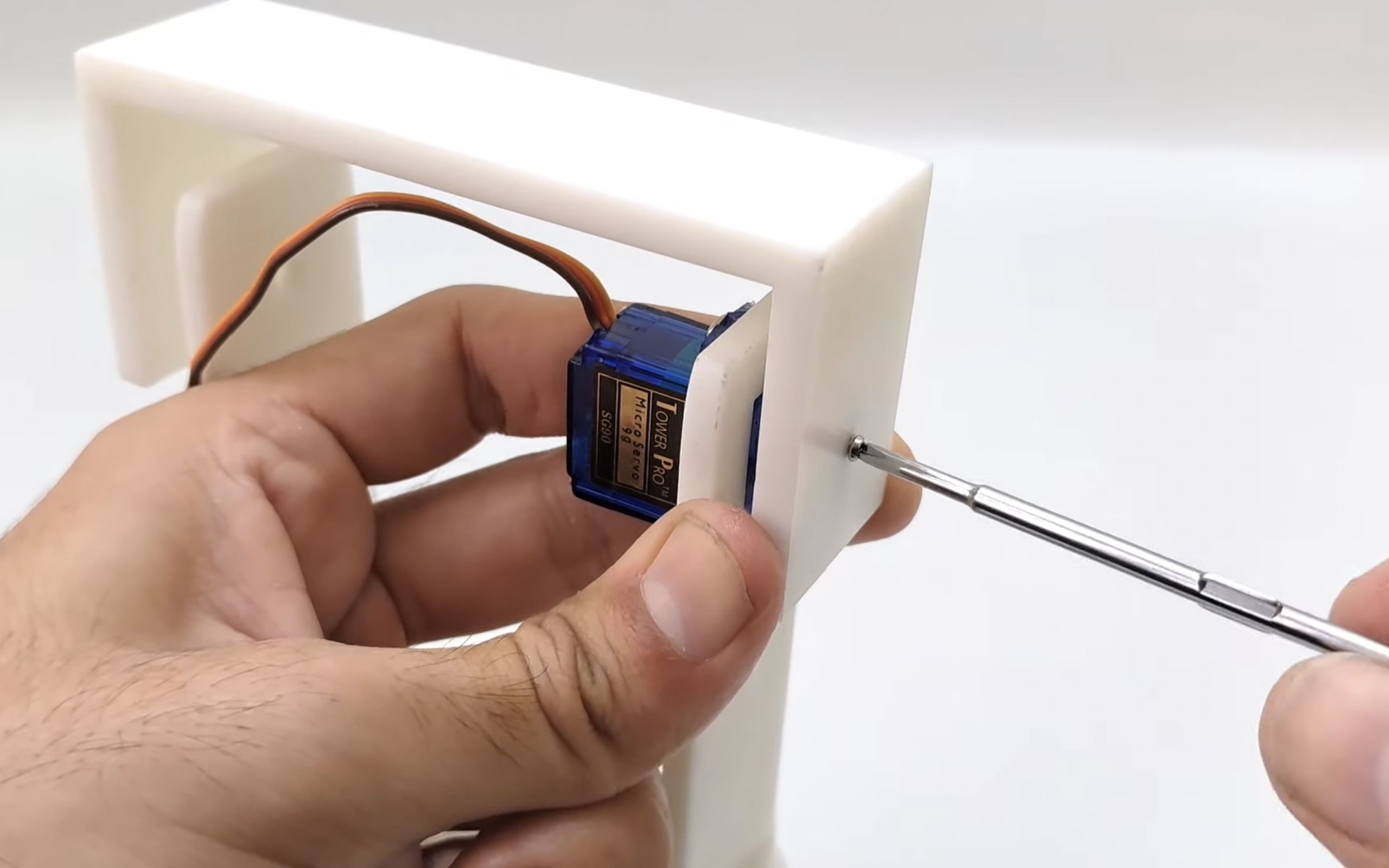 Attach the servo to the bottom of this piece using the two screws.