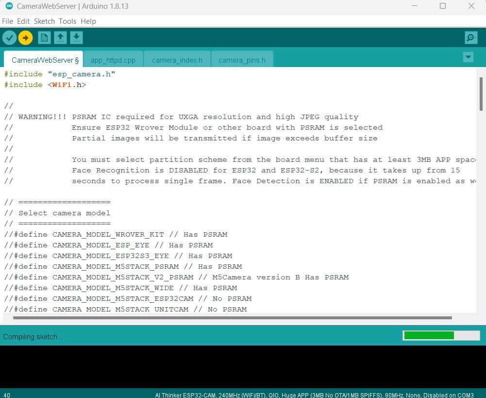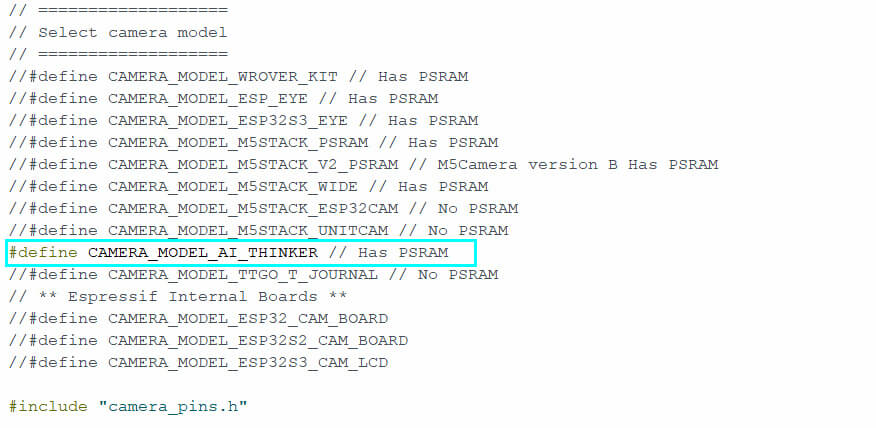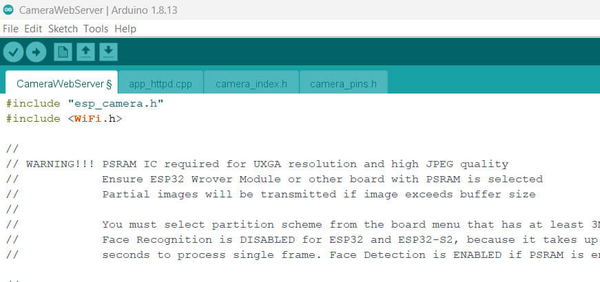 Go to Example> ESP32> Camera and open the CameraWebServer sketch, This will open the “CameraWebServer” example sketch.