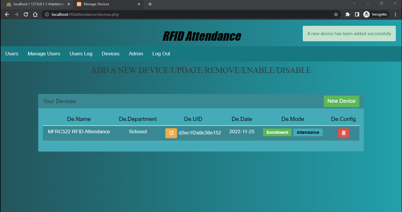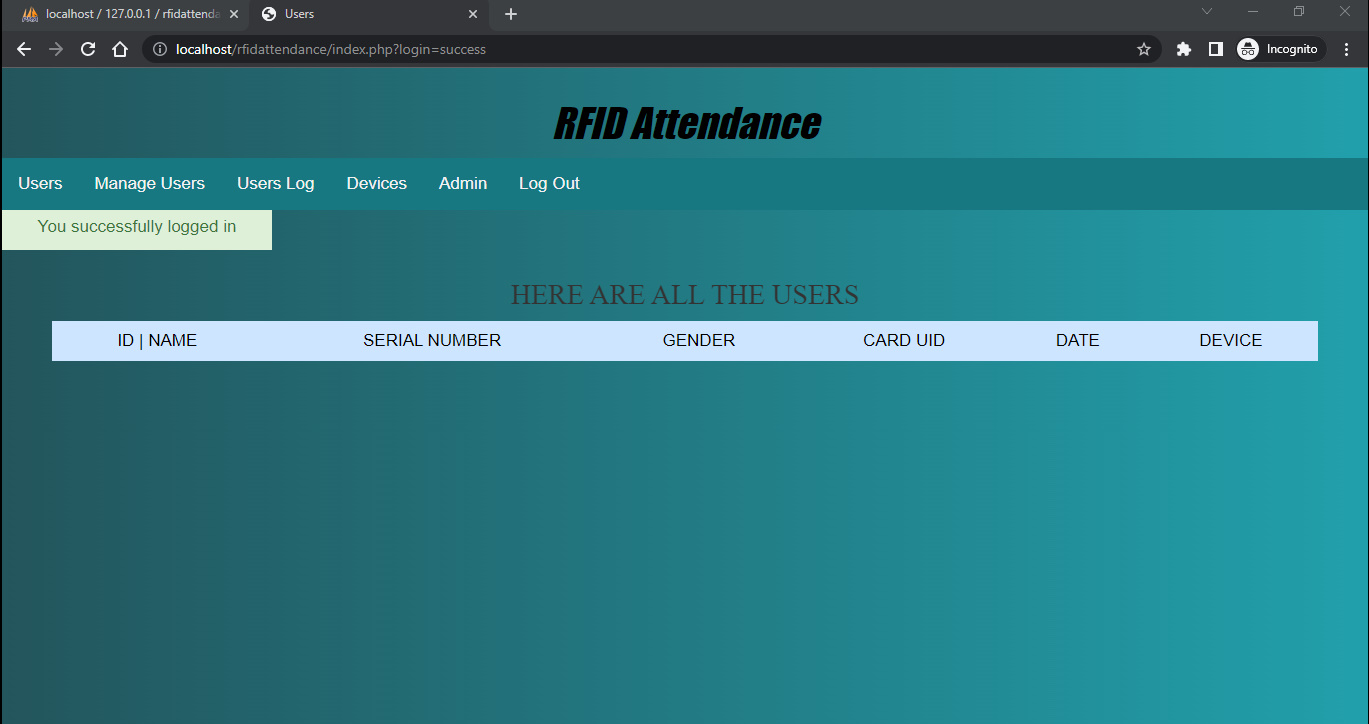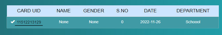 then click manage user and Put the RFID Card into the reader and you will see the card UID print on the localhost web page you can edit (NAME, GENDER, Etc)
