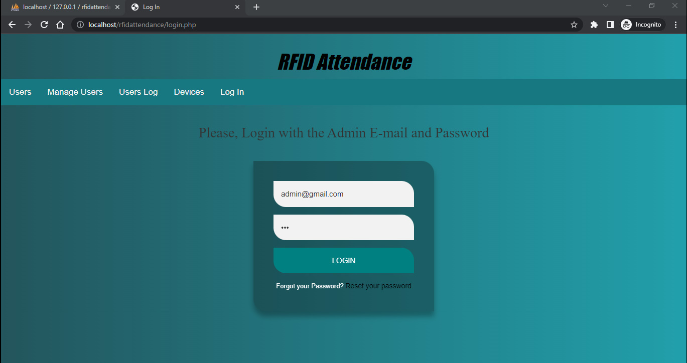 http://localhost/(your folder name)/ or and go to the URL “http://localhost/rfidattenddance/”. Now, the admin login panel will be shown.