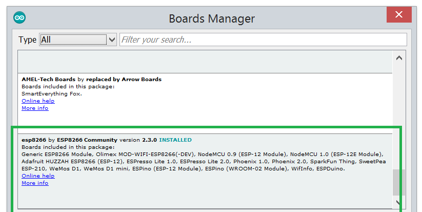 Once you have done that, open the Boards Manager by going to Tools > Board > Boards Manager. Search for ESP8266 and install the esp8266 platform.