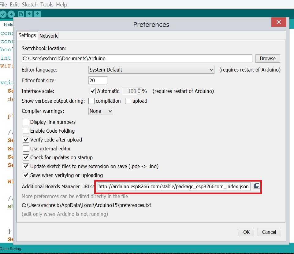 We will first need to install the ESP8266 board in the Arduino IDE. To do this, go to File > Preferences and add the following URL to the Additional Board Manager URLs field: