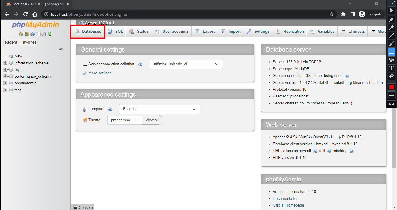 - Now open the MySQL using browser: http://localhost/phpmyadmin