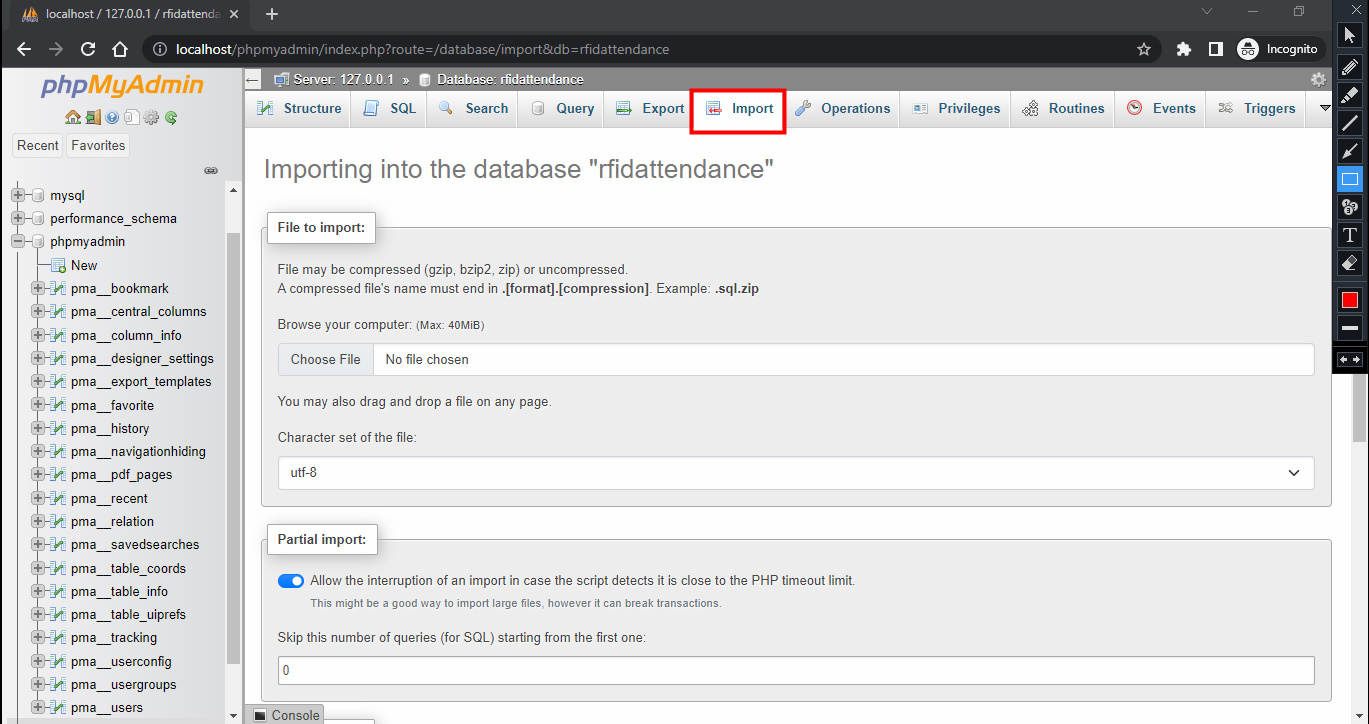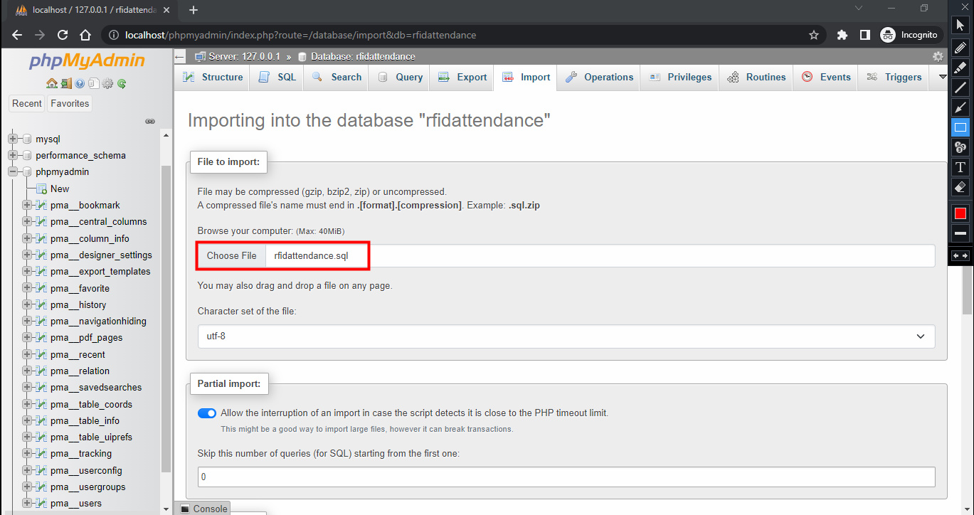 - Click on the browse file and then select the “rfidattendance.sql” file found inside the rfidattendance folder.