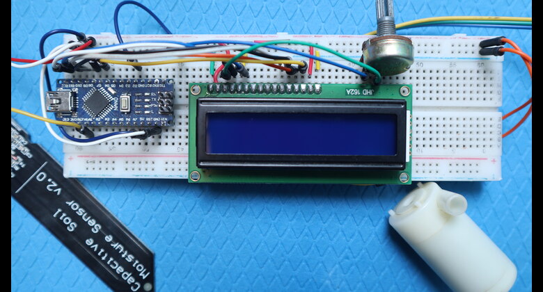 Moving to the LCD Display part, we have used a 16×2 Character LCD Display. The LCD will display the amount of Soil Moisture present in the Soil. Apart from Soil Moisture, it will also show the status of the motor whether it’s turned on or off.