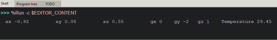 After uploading the All MicroPython script on the Raspberry Pi Pico board the MPU6050 sensor will start Printing the values being read for Accelerometer, Gyroscope, and Temperature. in the thorny IDE Shell window.