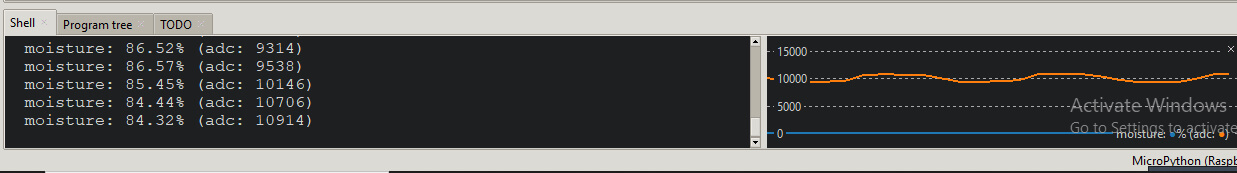 1 2 3 4 5 6 7 8 9 10 11 12 13 14 15 16 17 18 | from machine import ADC, Pin import utime # use variables instead of numbers: soil = ADC(Pin(26)) # Connect Soil moisture sensor data to Raspberry pi pico GP26 #Calibraton values min_moisture=0 max_moisture=65535 readDelay = 0.1 # time between readings while True: moisture = (max_moisture-soil.read_u16())*100/(max_moisture-min_moisture) # print values print("moisture: " + "%.2f" % moisture +"% (adc: "+str(soil.read_u16())+")") utime.sleep(readDelay) # set a delay between readings |