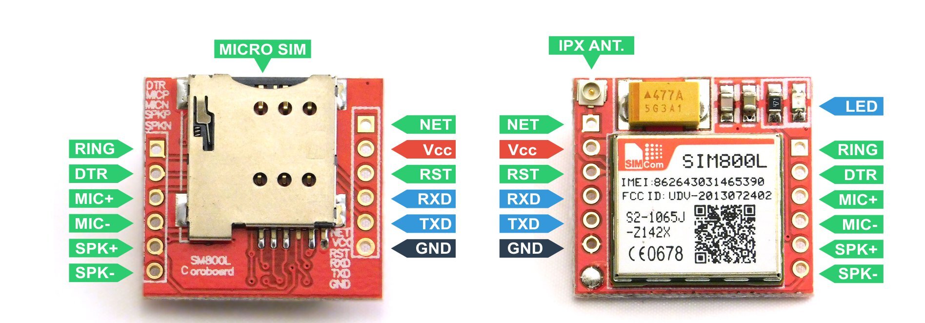 The SIM800L is a GSM module with a serial interface. It can send and receive text messages and receive calls. The SIM800L can be attached to a microcontroller using the serial UART interface, and in the example shown down, connected to an Arduino.