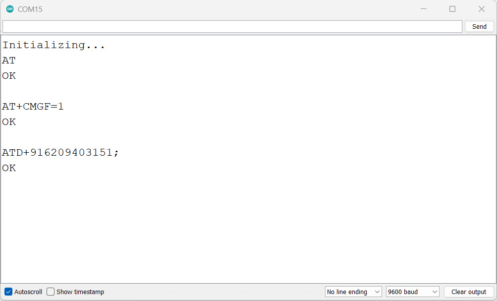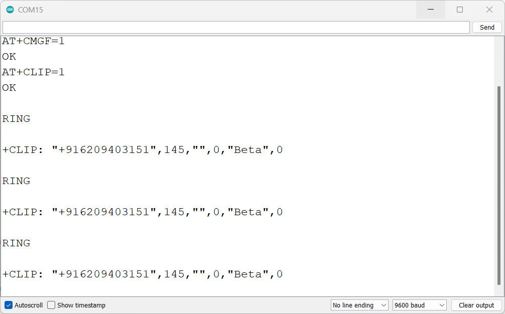 Make sure you have connected the SIM800L module correctly to the Arduino and have a valid SIM card with active calling capabilities. Upload the code to your Arduino, open the Serial Monitor, and you will start seeing a “Call Ring!” message.