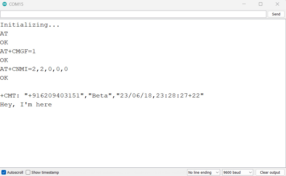 This code enables the Arduino to send and receive AT commands to the module, which can be used to perform actions like sending SMS messages or making phone calls.