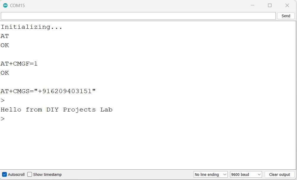 1 2 3 4 5 6 7 8 9 10 11 12 13 14 15 16 17 18 19 20 21 22 23 24 25 26 27 28 29 30 31 32 33 34 | #include <SoftwareSerial.h> SoftwareSerial mySerial(3, 2); void setup() { Serial.begin(9600); mySerial.begin(9600); Serial.println("Initializing..."); delay(1000); sendATCommand("AT"); sendATCommand("AT+CMGF=1"); sendATCommand("AT+CMGS=\"+ZZxxxxxxxxxx\""); // Enter your phone number here (prefix country code) sendATCommand("Hello from DIY Projects Lab"); // Enter your message here mySerial.write(26); } void loop() { } void sendATCommand(const char* command) { mySerial.println(command); delay(500); while (mySerial.available()) { Serial.write(mySerial.read()); } Serial.println(); } |