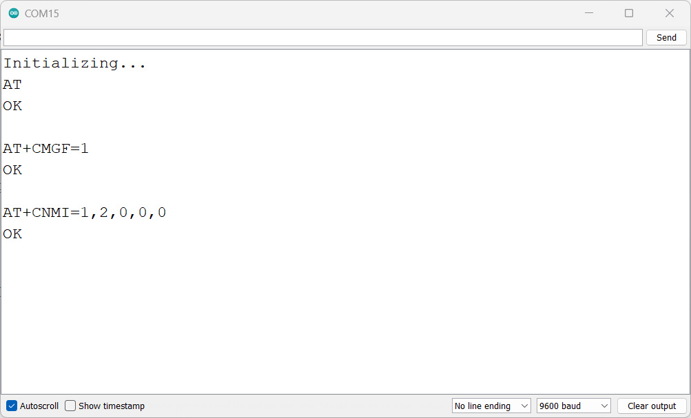 Once you upload the code to the Arduino board, you’ll be able to send all the AT commands in order to send/receive text messages or make calls.