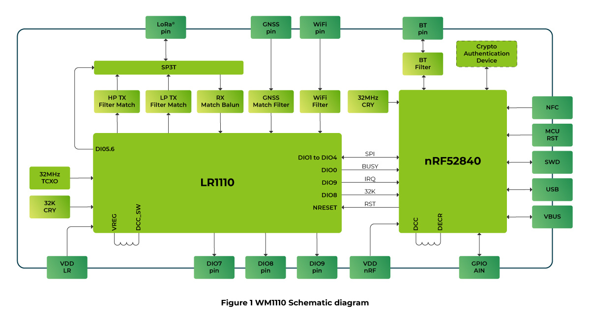 Introducing the Wio-WM1110: An all-purpose module for creating long-range IoT applications with low power consumption. This module combines LoRa technology with Semtech LR1110 and Nordic nRF52840 chips. It also includes GNSS, Wi-Fi, and Bluetooth capabilities for accurate location-tracking services.